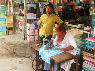 Esta foto no la pongo por estar cosiendo a maquina en la calle, escena que se vé en cualquier ciudad de Asia, la pongo porque hay muchos hombres que se dan gena en el pelo y en la barba, chocante no ?